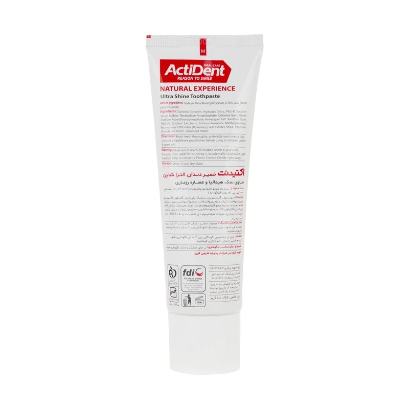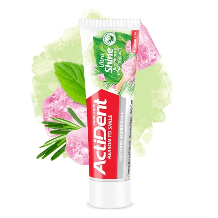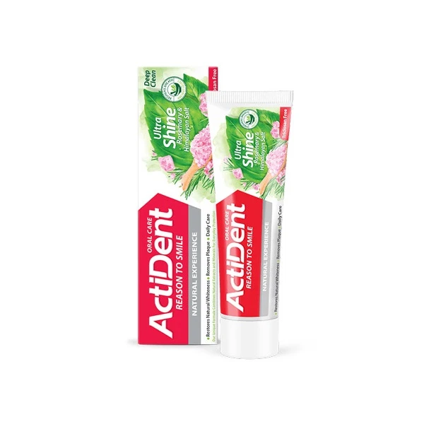 خمیر دندان الترا شاین اکتیدنت حاوی نمک هیمالیا و عصاره رزماریست. این ترکیب باعث براقیت و حفظ سفیدی طبیعی دندان ها می شود. علاوه بر آن رزماری و نمک هیمالیا به عنوان ضد عفونی کننده های طبیعی با کنترل باکتری های مضر دهان باعث از بین رفتن بوی بد دهان می شوند. خمیر دندان الترا شاین را برای افرادی که به سفیدی طبیعی دندان هایشان اهمیت می دهند طراحی شده است تا با ترکیبی از طعم جذاب اکالیپتوس، نعنا و کمی نمک مراقبت از دهان و دندان برایشان لذت بخش باشد.