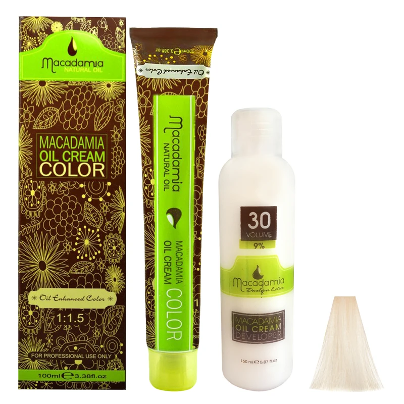 رنگ مو ماکادامیا شماره 11.11 حجم 100 میلی لیتر رنگ بلوند دودی خیلی روشن قوی به همراه اکسیدان ماکادامیا مدل 30vol نه درصدی حجم 150 میلی لیتر