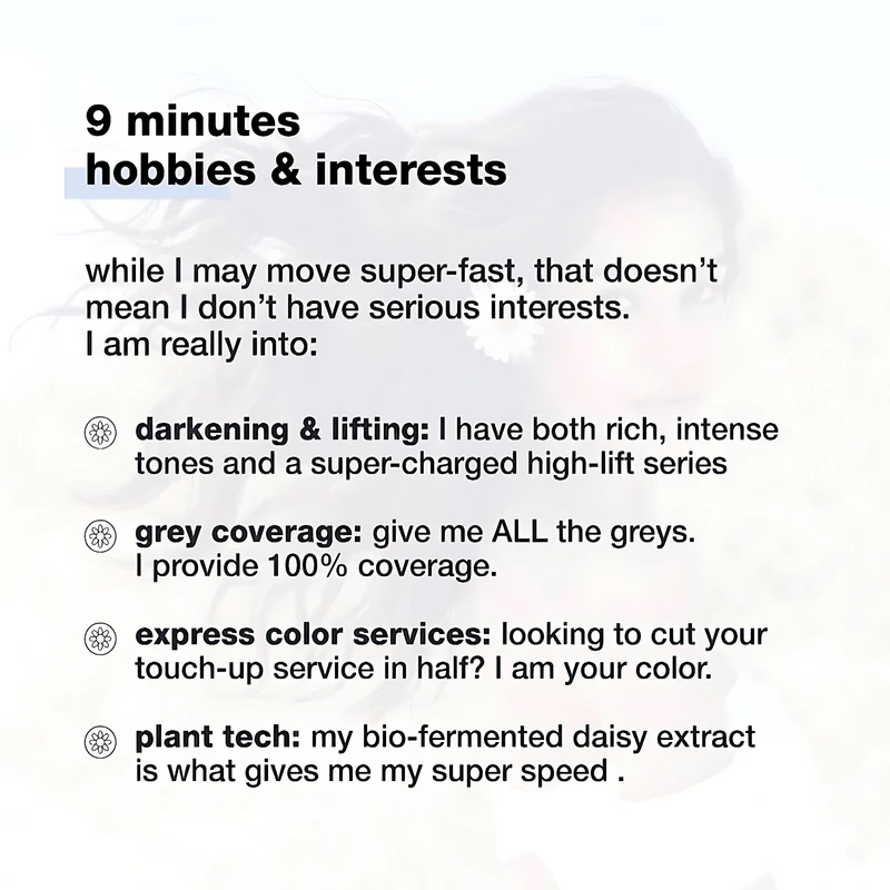 ضد حساسیت، فاقد آمونیاک، سولفات، نمک، PPD، پارابن و مواد نگهدارنده با تاثیر گذاری تنها در ۹ دقیقه