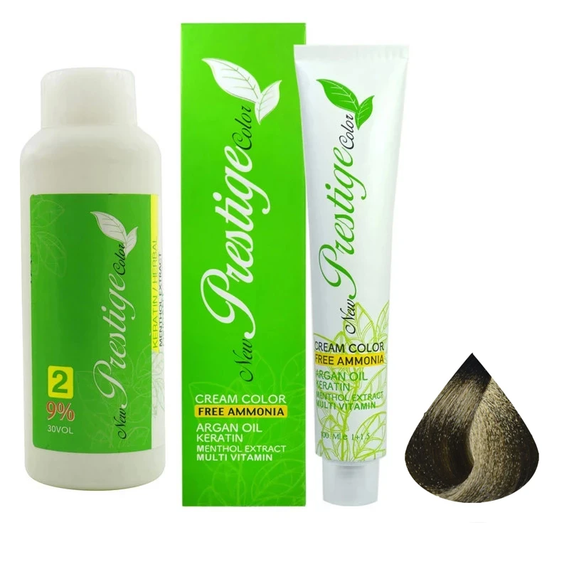 اکثر خانمها بهدنبال تغییر و تحول در ظاهر خود هستند که استفاده از رنگ مو میتواند این تغییر چشمگیر را در چهرهشان ایجاد کند. این محصول با حجم 100 میلیلیتر برای موهای نسبتا بلند در حد متوسط جوابگو خواهد بود. نیو پرستیژ کالر به شما امکان میدهد تا موهای سفید خود را با استفاده از این رنگ مو پوشش دهید. .رنگ موی بدون آمونیاک نیو پرستیژ کالربه وسیلهی پروتئین، کراتین ،روغن آرگان وعصاره نعناع غنی شده است. کراتین عمدهترین مادهی تشکیل دهندهی ساقهی مو محسوب میشود اما این ماده بر اثر استفاده ی مداوم از مواد شیمیایی مانندرنگ، مش، فر، براشینگهای مداوم و حتی بر اثر استفاده از سشوار داغ از بین میرود و در نتیجهی آن، موی سر هنگام شانه زدن میشکند. رنگ موی نیو پرستیژ کالربا دارا بودن مادهی حیاتی کراتین، پادزهرِ این حالت را در بطن خود دارد، لذا شما با استفاده از این محصول فقط مویتان را رنگ نمیکنید بلکه موهایتان را تقویت نیز میکنید،این رنگ مو حاوی بیشترین غلظت مواد گیاهی است و قابل استفاده برای زنلن باردار است با استفاده از این رنگ مو به موهایی نرم و درخشان دست پیدا می کنیم.رنگ موهای پرستیژ تحت عنوان محصولات مراقبت از مو فرموله شده اند و همچنین برای افرادی که موهای خود را کراتین تراپی – بوتاکس تراپی – پروتئین تراپی و… مناسب می باشد رنگ موهای پرستیژ به مو و پوست سر آسیب نمی رسانند و خطر آلرژی را به حداقل می رسانند. به همراه اکسیدان 9 درصدی ارائه می گردد