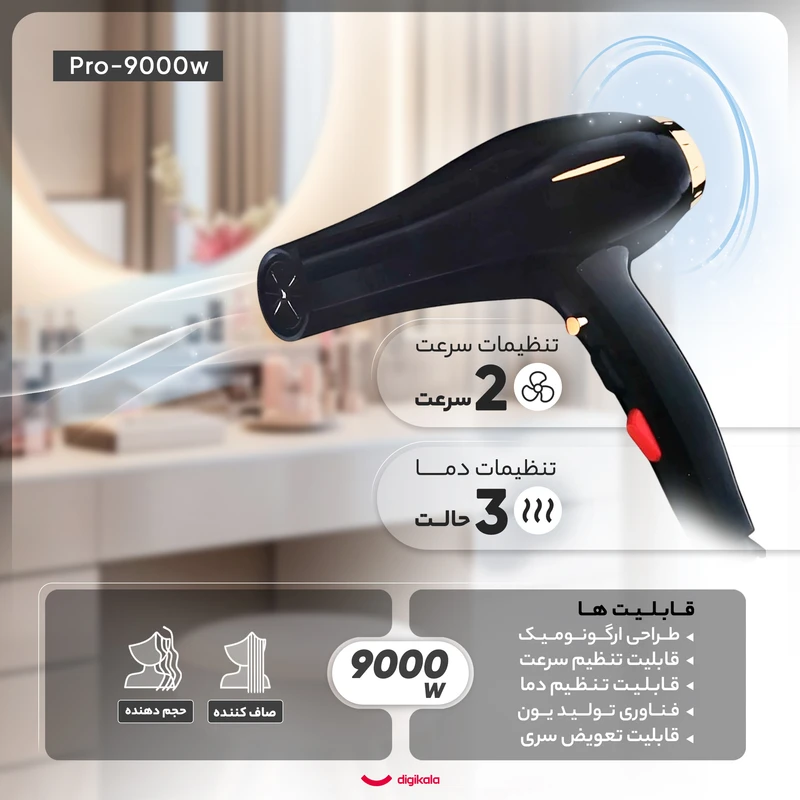 سشوار حرفه‌ای مدل pro_9000w، موتور AC با توان مصرفی 9000 وات، دارای قابلیت تعویض سری، باد سرد و فناوری تولید یون، طراحی ارگونومیک، با حالت صاف‌کننده و حجم‌دهنده، وزن 574 گرم، تنظیم حرارت 3 حالته و کنترل سرعت 2 حالته، به همراه 1 عدد سری متمرکزکننده