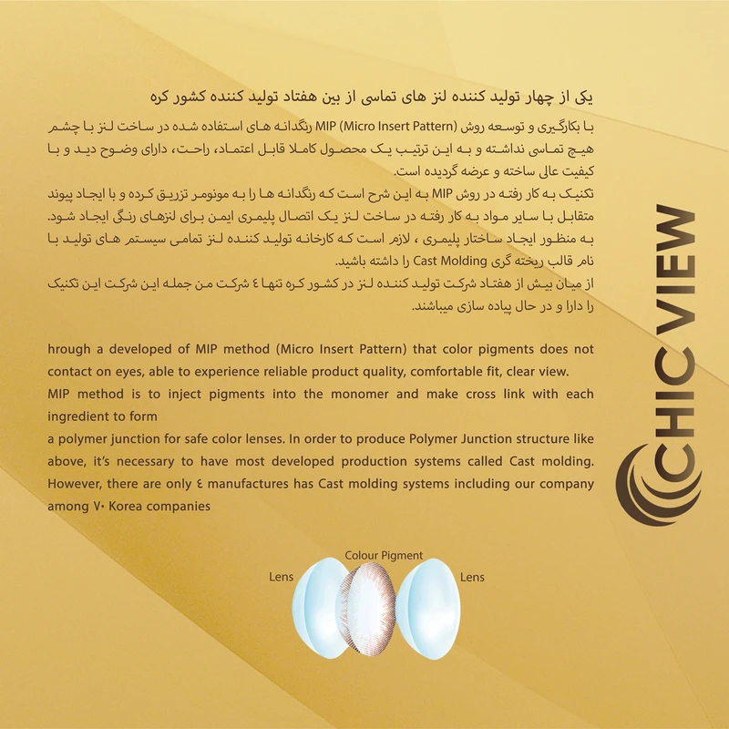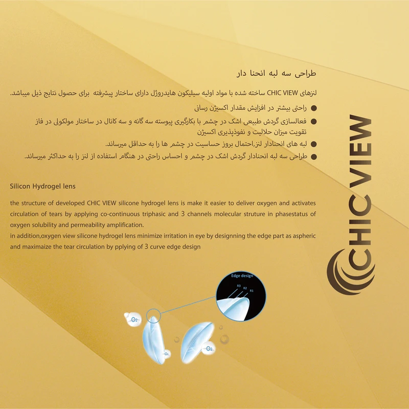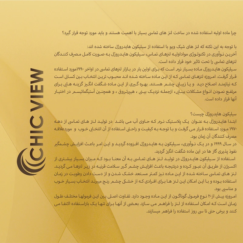 لنز رنگی چیک ویو یکی از پر طرفدارترین برندهای لنز رنگی است. این لنزهای رنگی اکسیژن رسانی با فناوری هایدروژل دارند. می توانند به راحتی اکسیژن را به چشمان شما انتقال دهند. همچنین لنزهای تماسی رنگی chic viewدارای مواد سازنده Polyhema هستند که رطوبت را تا حدالمقدور حفظ میکند و مانع از خشکی چشم میشود. این لنزهای رنگی از کیفیت بسیار بالایی ساخته شده و دارای طراحی نازک و نرم، اما بسیار راحت هستند و این راحتی را برای شما تضمین می کنند. لنزهای رنگی {چیک ویو} دارای تنوع رنگی بسیار بالا هستند و پوشش دهی کامل آن باعث شده یکی از برندهای پرطرفدار بین لنزهای رنگی در اروپا و آسیا شود. این لنزهای رنگی آبرسانی مناسبی دارند و برای افرادی که چشمانی حساس و خشک دارند، ایده آل است و می تواند انتظارات مصرف کننده را فراهم کند..